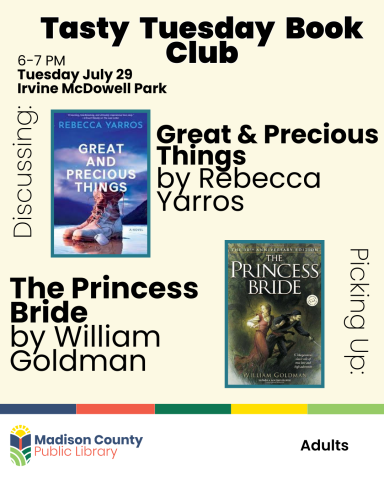 The Madison County Public Library will be at Tasty Tuesday for our Tasty Tuesday Book Club! We will Discuss Great and Precious Things & participants will receive June's book pick: The Princess Bride. We meet the last Tuesday of the month, 6-7 PM. In the event of inclement weather, Tasty Tuesday will meet at the Madison County Public Library, Richmond, room # 138.